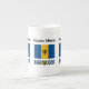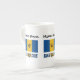Bone China mug featuring the Barbadian Flag with the word BARBADOS below in the colours of the flag. A place for your name allows for a personalised look. If you need a customised gift just add someone else's name. The Bajan flag is ultramarine and gold with a black trident. Design shows on three sides of mug.