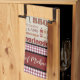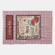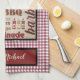 This colourful kitchen towel is a wonderful gift for Dad for Father's Day! It features a large square with a barbecue grill and condiments in it along with typography including steak, barbecue, tomatoes, lamb, marinade, vegetables and more. Background is red and white gingham check and the bottom has a solid red panel with a black border for you to personalise with your Chefs name. There's also another towel, a pot holder and oven mit set and a matching apron in our shop.