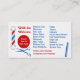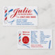 This customisable business card for barbers and barbershops displays a barber pole, clippers and scissors/shears. Can use back side for notes or as appointment card. Uses the traditional red & blue barber colours. All graphics created by Dale Arthur for Whiz Creations.