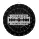 Barber shop dartboard with razor blade design. Custom decor for men's hair salon. Stylish gift for hair salon owner. Make your own trendy barber shop present for boss, coworker, employees etc. Unique hair stylist gift ideas. Personalised with your own business name or company slogan. Masculine decoration with sharp edge. Black and white.