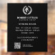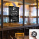 Barbershop opening hours, call for appointments, and QR CODE widow clings with a generic predefined logo (you can replace it with your own) featuring circled scissors and a straight razor with a laurel wreath over a solid black background. ++++++++++++ With a masculine look, the template is suitable for men salon, men personal care services and products - grooming, hair styling, wellness, tailors, clothing and shoe stores and more.