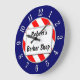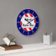 A unique custom wall clock reading Barber Shop in retro script and block letters on a red and white striped background surrounded by white numbers with a thin blue outline on a dark blue face.