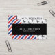 A fashionable design for a hairstylist featuring a classic barber striped design on one side with red and blue stripes on a white background and a black and white scissor pattern design on the other side. In the middle, there is a black box for your name and profession, or a business name and tagline. On the back, the design is repeated with more space for your details.