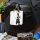The back of every card features the bold and stylish. detailed image of a cool, handsome barber against a crisp white background. He is wearing a stylish apron with a pair of scissors and two different combs in the pocket, striking a confident pose. In his hands, he holds a hairdryer like a gun in one hand and a comb like another weapon in the other, reinforcing his bold, edgy style.