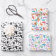 Hair stylist themed wrapping paper sheets featuring a pattern of scissors, combs, and hair dryers in three different colour variations: black and white; tomato red, yellow, blue, and purple; and pastels.