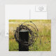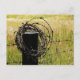 A hastily coiled roll of rusted barb wire fencing, tossed on a weathered farm fencepost. A wide field of tall, sunbleached grasses sway in the breeze in the background, their tops heavy with seeds. This is the typical rural country scene for anyone with livestock or pasture areas.