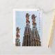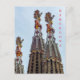 A close up photograph of some of the intricately decorated steeples of the Sagrada Familia Basilica in Barcelona in Spain printed on a postcard.