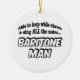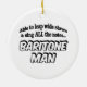 A fun Baritone superhero design in black and white with comic book lettering, easy to read typography. It says "Able to leap wide staves and sing ALL the notes, Baritone Man"