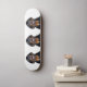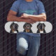This skateboard shows a triple view of a barking Rottweiler named Heidi. Looking fierce in this photograph with her mouth open, teeth showing, and a protective look on her face, Heidi was actually only happily barking to have me throw her favourite toy, a bucket. A perfect skateboard for every Rottweiler lover.