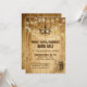 Whiskey Chandelier Barn Sale invitation on wood with whiskey barrel, chandelier, and string lights