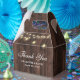 Rustic wood wedding thank you favour box featuring string lights on a barn wood background.