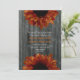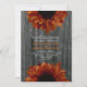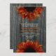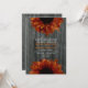 A simple fall wedding invitation featuring orange sunflowers peeking out from top and bottom. Background is barnwood. Customise the matching text at centre with details of your wedding. Opposite side features matching barnwood background. Personalise with the names of the bride and groom over monogram. Recycled paper.