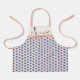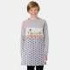 Cute farm animals bib apron for kids. Blue hearts pattern along the bottom with a row of fun barnyard animals at the top. Add her name on the pink strip of colour beneath the animals. Straps are also pink to match. Animals featured include a goat, bunnies, chicken, pig and little birds. Use this apron when helping in the kitchen or planting in the garden or greenhouse.