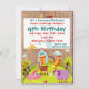 Personalise this birthday party template with your own party details. Features a cute Barnyard Farm Animals theme with a printed burlap background. Has a colourful and funny rooster, cow, pig, sheep, barn, windmill, apple orchard, sun, and flowers. The burlap is just a printed design, not actual burlap fabric.