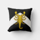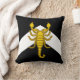 "Sable, a chevron argent, over all a scorpion or." Populace badge for the Barony of al-Barran (SCA). Back of pillow is an allover pattern in coordinating colours.