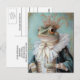 A regal frog, positioned centrally within a vertical portrait frame, is the main subject. The frog has smooth, mottled green skin with large, prominent golden eyes that gaze directly forward. It is adorned with an elaborate gold crown, intricately detailed, and wears a lavish white ruffled collar. The frog is dressed in a rich, dark teal and gold patterned coat, indicative of royal Baroque fashion. A delicate butterfly rests on its crown. The background is a soft, muted teal, providing a gentle contrast. The composition is reminiscent of a classical portrait, with warm, soft lighting that highlights the textures and details, creating an elegant and whimsical atmosphere.