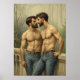 This highly emotive artwork captures two male figures in a deeply intimate interaction, rendered in a Baroque or Academic oil painting style that evokes the dramatic use of light, shadow, and emotional depth characteristic of classical masters. The style emphasizes a heightened realism and idealized form, set against a soft, muted, classical-looking balcony or garden background. The subjects are positioned face-to-face, their gazes locked in a tender, focused manner, strongly suggesting a committed, romantic relationship and mutual devotion. They are depicted with idealized, strong physiques, featuring defined musculature and full, styled hair and beards. The figures are clad in dark denim jeans with brown leather belts, which grounds the classical rendering in a modern, rugged aesthetic. The piece powerfully explores the themes of love, intense connection, and emotional vulnerability through its masterful technique and compelling, timeless composition.