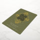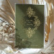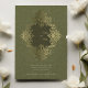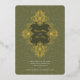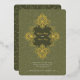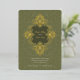 This exquisite wedding invitation features an intricate Baroque ornament design in radiant gold foil against a rich olive green background. The ornate detailing frames the couple’s names and event details, adding a luxurious touch to the overall aesthetic. The reverse side continues the opulent theme with a matching Baroque-inspired pattern, making this invitation perfect for formal weddings that embrace classic elegance and grandeur. Ideal for couples seeking a timeless and sophisticated design, this card is sure to make a lasting impression.