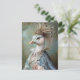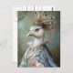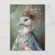 A regal peacock, positioned centrally within a vertical frame, is the main subject. The peacock has a pale blue and white feathered head and neck. It wears a gold crown adorned with a jewel, and has a ring of peacock feathers around its head. The peacock is dressed in an ornate, ruffled, lacy collar and a feathered, cape-like garment in shades of blue. The bird is accessorized with a delicate necklace. It is surrounded by large pale pink and white roses. The peacock’s head is in a slight three-quarter profile facing to the left, with a gentle expression and large blue eyes. The background is a soft, muted teal with stylized, leafy embellishments. The lighting is soft and diffused, creating a serene, almost painterly atmosphere. The composition is reminiscent of a portrait, emphasizing the elegance and majesty of the bird.