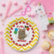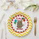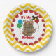 Barrel of Monkeys 3rd birthday paper plates features a brown barrel with four little brown monkeys, two inside the barrel, two outside, one eating a banana! There's also birthday balloons of blue, red, yellow, and green with text that reads It's My 3rd Birthday! The outside border of the plate is yellow and white chevron stripes. These colourful and fun monkey birthday party plates are great for the third birthday celebration!
