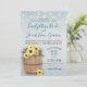 Wine vineyard, rain barrel full of bright yellow sunflowers, baby's breath, twigs and pine cones. Faint wood planks in background and accented with delicate twinkling string lights. Rustic and elegant blue and yellow sunflower wedding invitation.
