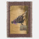 A cowgirl races around the barrels in a rodeo. The look of tooled leather surround it.