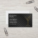 Bartender business cards with cool black stripes background, graphic image of a gold martini glass, and and text space you can personalise to work for your service. Designed as a business card template for an entertainer, mobile bartender, or barkeeper.