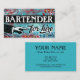 Colourful arty Bartender business cards in turquoise, aqua, red, yellow. Bartender for hire business cards.