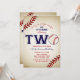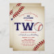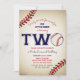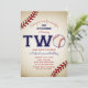 Baseball 2nd Birthday Invitation. Batter-up! This festive baseball design is sporty fun for your child's second birthday. The design features a vintage baseball background with the word "Two" having the "O" replaced with a baseball.