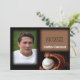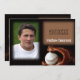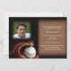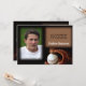 This fun and sporty graduation announcement is a modern twist on a classic look. Celebrate your Senior's love of baseball or even their scholarship! The background is dark brown to black. Your senior's photo goes to the left and a baseball in a baseball glove in the lower right. Your customizeable invitation or announcement text is on the back in black.