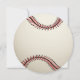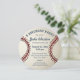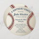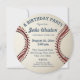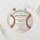 Round baseball shaped birthday party invitation with blue text for all ages.