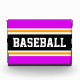 This sporty, athletic design features bold BASEBALL text inside a highlighted wide centre black stripe with white and yellow pinstripes against bright tropical pink outer stripes. The text can be personalised.