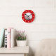 Photograph of a baseball in the centre of the clock with a burgundy background and white letters.