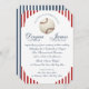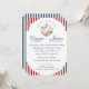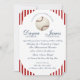Vintage inspired red and blue striped pattern baseball theme wedding invitation with elegant fonts and classic style formal text.