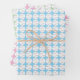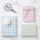 Cute wrapping paper flat sheet set for people and kids who love ball games with a very simple pattern of a doodle baseball . One sheet is light blue , one is pink and on is light green .