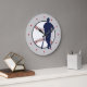 This is an attractive wall clock for that guy who is a true baseball fan. It features a blue baseball player and bat silhouette against a white ball image complete with red stitching. The image is placed on a light grey background. Instead of numbers, this clock has red diamond markers....of course!