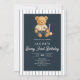 The heading Beary First Birthday stands out in retro calligraphy, bringing a touch of vintage flair that feels both timeless and joyful. Set against a background of navy blue stripes inspired by classic baseball uniforms, this invitation evokes the spirit of the ballpark while maintaining an elegant, polished look.