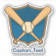 Baseball icon with two bats and a ball over a blue shield. Custom text.