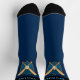 Baseball icon with two bats and a ball over a blue shield. Custom background colour. Custom top stripe colour. Custom monogram. Custom text on each sock.