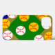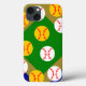 This phone case has a ball themed design of a ball field made from diamonds and half-circle and baseballs and softballs made of circles with threads.