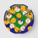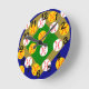This wall clock has a ball themed design of a ball field made from diamonds and half-circle and baseballs and softballs made of circles with threads.