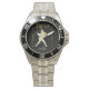 Has heft and feel of expensive stainless steel quartz watches. Good band with safety catch. I removed links, which is easy because engraved arrows show direction to push the linking pins. As always by this seller, the image (a railroad logo) is a perfect reproduction of my emailed image, and is precisely spaced and aligned.