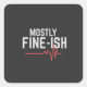 This design humorously captures the feeling of being "just okay." The main text, "MOSTLY FINE-ISH," is presented in bold, strong typography, contrasting with the underlying sentiment. A key graphic element is the flatline-to-spike heartbeat (ECG/EKG) line in red, visually representing a fluctuating or uncertain emotional state. Below the line, a witty subtitle reads: "The art of low-stakes ambiguity." It's a relatable and subtly sarcastic design perfect for anyone who prefers to keep their feelings a little ambiguous.