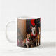 An enchanting scene captures the essence of cosiness and holiday spirit as furry companions adorned in Santa Claus hats gather around a crackling fireplace. The warmth emanating from the hearth creates a snug atmosphere for these adorable canines, while festive stockings hang in the background, enhancing the merry ambiance. The charming illustration portrays a timeless image of companionship and festive joy, perfect for celebrating the holiday season with a touch of canine charm.
