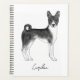 Destei's original black and white colour illustration of a cute Basenji breed dog drawn in digital ink wash style. There is also a personalizable text area for a name or other custom text.