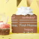 This basic and personalised birthday wrapping paper design features a message like "First-Name, happy 17th birthday!", where the name and birthday number can be customised. It also features decorative circle shapes. The background is coloured brown. Wrapping paper like this might be used to wrap gifts being given to somebody who is celebrating a birthday. [~Z0000243]