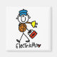 A stick figure electrician in a blue cap holds a roll of wire and a toolbox on Basic Electrician profession T-shirts, mugs, hoodies, cards, stickers, keychains, tote bags, and other electrician apparel and gifts.
