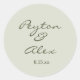 Basic, minimalist sage green wedding envelope seal sticker with dark green script text of the names of the bride and groom and their wedding date. Contact us for help with customisation or matching products.