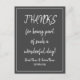 This simple wedding thank-you postcard design features the message "THANKS for being part of such a wonderful day!" on the front, along with a customisable message on the back. It could be used to offer thanks to somebody who was a guest at a wedding ceremony.