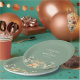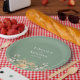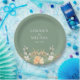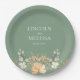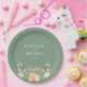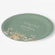 Pretty, modern and simple paper party plate features bottom floral spray with watercolor white and peach colour flowers and assorted sage and eucalyptus green leaves on trendy basil green background. Customise couple's name and wedding date in white modern fonts